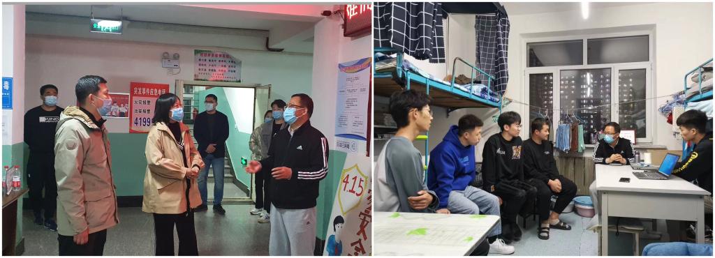 走访期间,王琦分别对学生公寓中辅导室、谈心谈话室等辅导员办公区域的数量,党团活动室、学生自习室等学生活动区域的配备,以及自助热饮机、打印机等公共服务设施的使用情况进行了详细调研。在与住校辅导员和在校学生交流的过程中,他详细了解了校园封闭管理期间同学们网课学习效果以及生活上的困难和需求,并就学校“一站式”社区建设工作向住校辅导员广泛征求合理化建议。