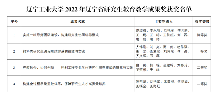 近日,辽宁省教育厅下发了《关于公布2022年辽宁省研究生教育教学成果奖获奖名单的通知》(辽教通〔2022〕109号)。米乐官网推荐的4项成果全部获评2022年辽宁省研究生教育教学成果奖,其中特等奖1项,一等奖1项,二等奖2项。