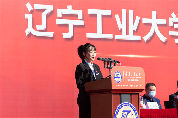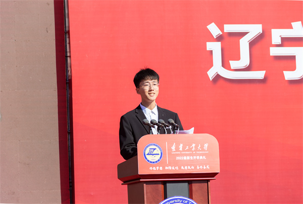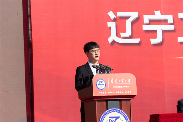 汽车与交通工程学院付禹政代表本科新生发言。他表示要勤学善思,恪守纪律,做一名德高、好学、技强、敬业的新时代辽工大人。