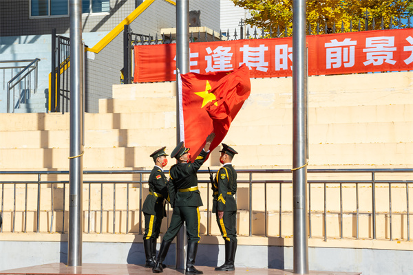 上午10:00,典礼正式开始。英姿飒爽的国旗护卫队队员迈着矫健的步伐,将国旗护送至场内,鲜艳的五星红旗伴随着庄严的国歌声冉冉升起,迎风飘扬。