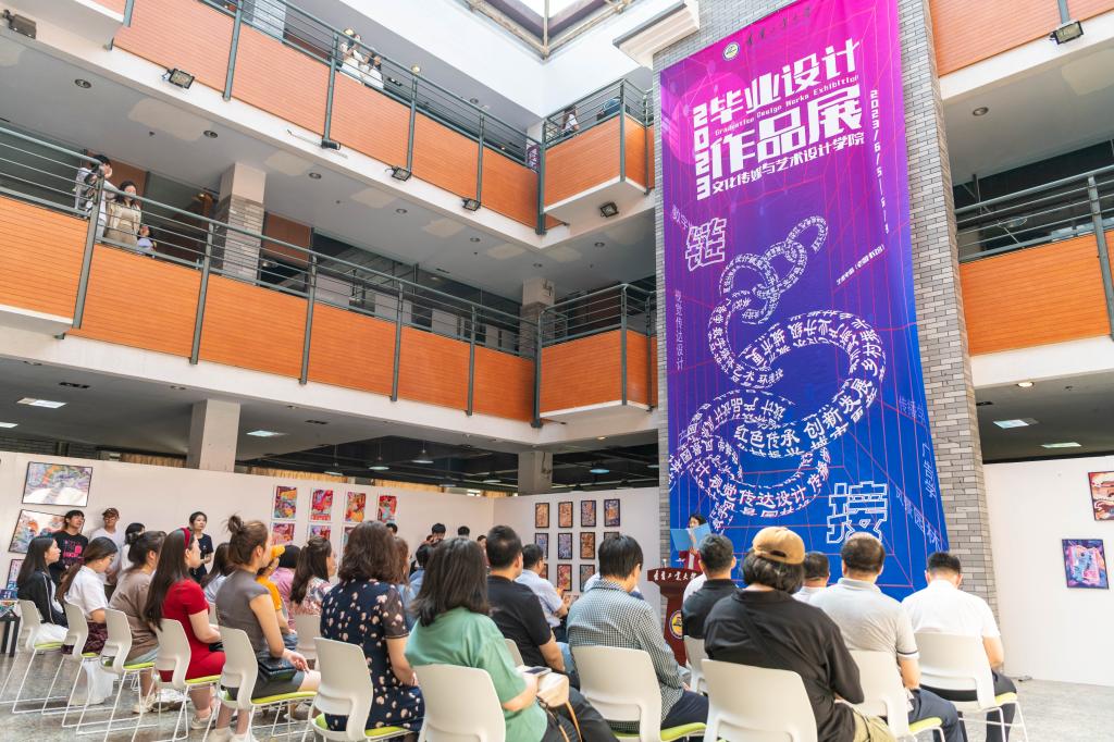 本届毕业设计展以“链接”为主题,体现艺术与科学的链接、高校与社会的链接、设计与发展的链接。展览涵盖视觉传达设计、环境设计、产品设计、数字媒体艺术、风景园林、广告学、传播学等7个专业298名毕业生的作品,内容涉及乡村振兴、城市绿色发展、产业品牌价值赋能、红色文化传播、文化创新等多项重大主题,毕业生们在艺术设计的实践中锻炼技能、增长才干,用设计解决问题,用设计传递情感,用设计提升品质,用设计传承文化,提升了创作服务社会和人民的责任感与使命感。(洪春英 文/李刚 摄影)