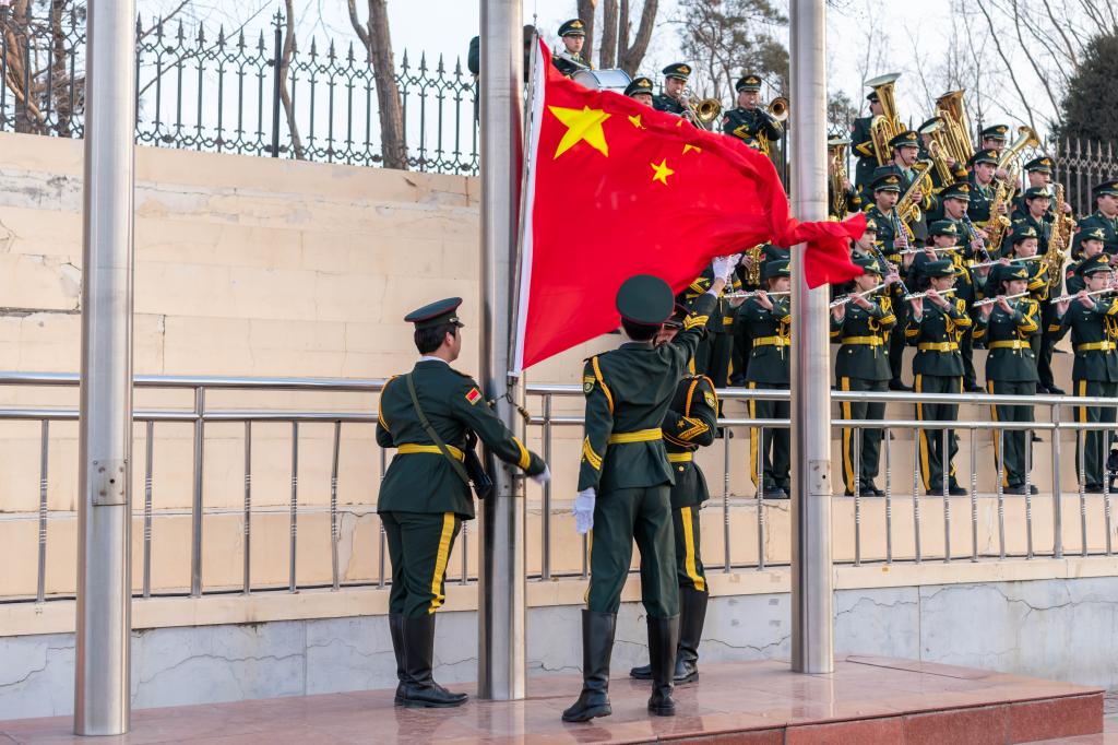 早7时整,学校国旗护卫队昂首阔步,护卫着国旗步入升旗台。伴随着大学生军乐团演奏的《义勇军进行曲》,鲜艳的五星红旗冉冉升起。全体师生庄严肃立,齐唱国歌,向国旗行注目礼。