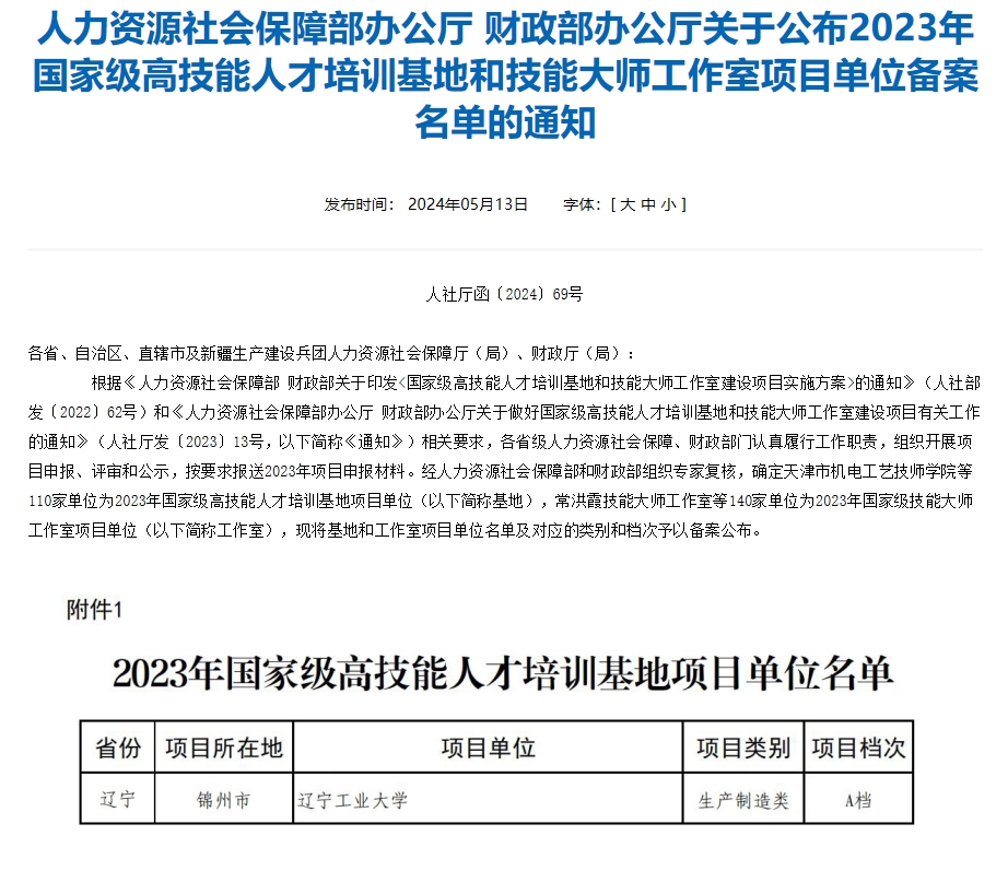 近日,国家人力资源社会保障部办公厅、财政部办公厅公布2023年国家级高技能人才培训基地和技能大师工作室项目单位备案名单,米乐官网成功获批国家级高技能人才培训基地项目单位,机械制造基础加工、工业机器人操作系统、化学原料和化学制品制造三个培训项目获批生产制造类A档项目。
