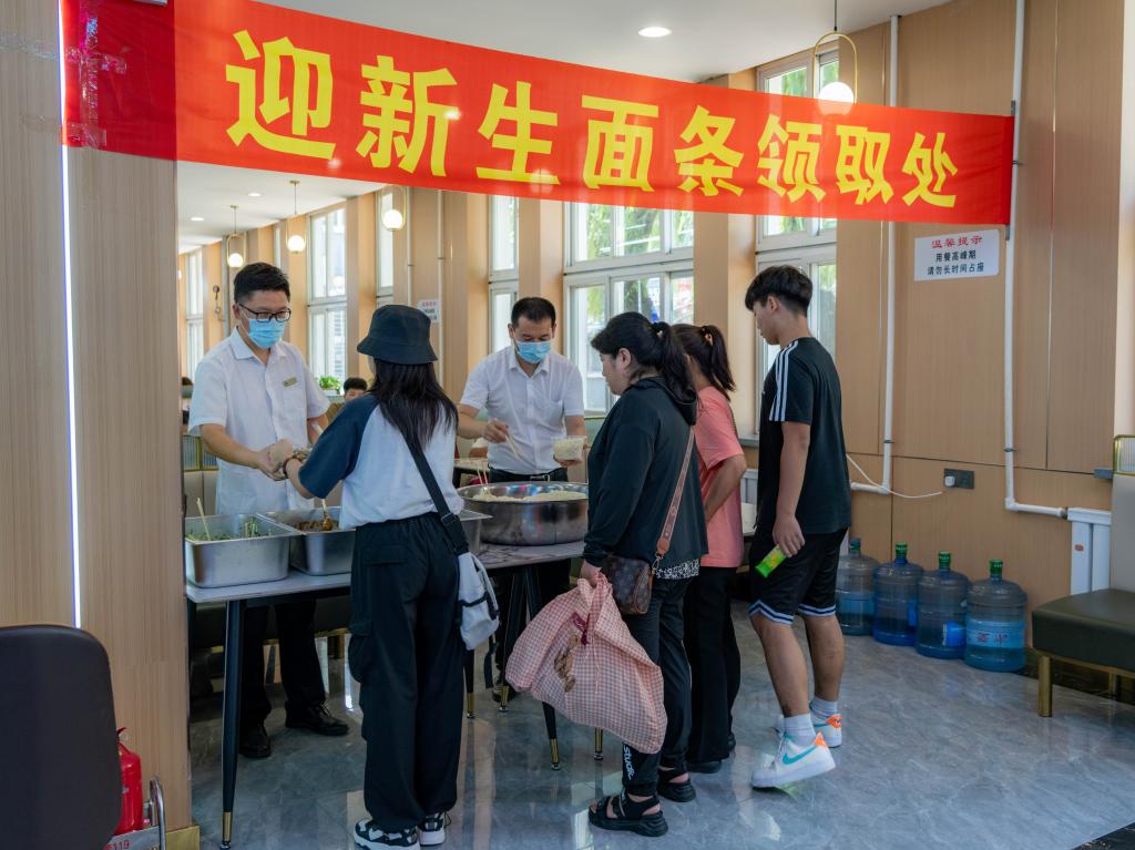 在勤学园餐厅,校领导详细了解迎新菜品情况,并与新生父母亲切交谈。学校准备了“迎新面”,让新生免费领取。“上车饺子下车面”,吃在嘴里,暖在心里,一根根面条就像学校对每一名新生的丝丝牵挂,也代表了学校对新生的热切欢迎和美好祝愿。