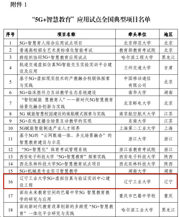 日前,工业和信息化部、教育部印发通知,公布“5G+智慧教育”应用试点全国典型项目及通过验收项目名单,44个入选全国典型项目,93个通过验收。“米乐mile官方网站5G+虚拟仿真与验证实训中心建设工程”项目成功入选全国典型项目,为辽宁省唯一入选项目。