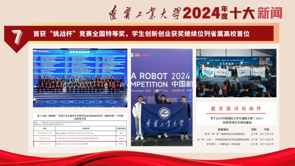 延伸阅读:2024年,学生在2024中国机器人大赛暨RoboCup机器人世界杯中国赛智能清洁机器人挑战赛项中获得全国冠军,在2024年中国大学生方程式汽车大赛和中国大学生无人驾驶方程式大赛中获得全国一等奖,在2024年中国国际大学生创新大赛中获得国家级铜奖3项,大创项目学术论文首次入选第十七届全国大学生创新年会,全年累计获得国家级奖项200余项,数量再创新高。在中国高等教育学会全国学科竞赛排行榜榜单中,8轮总排名继续位列省属高校首位。