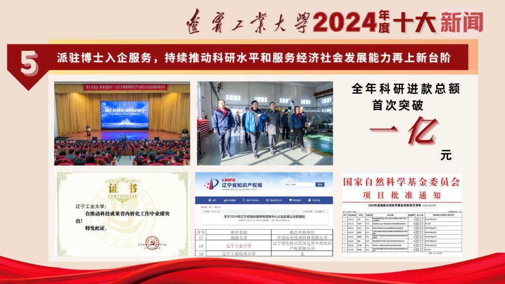 延伸阅读:2024年,博士入企行动破解企业技术难题93项,签订横向项目26项,项目合同额超过1100万元。学校李青春教授团队与中国科学院金属所李殿中院士团队合作,解决大连某企业“卡脖子”技术难题,帮助企业年产值增加3亿元。学校被辽宁省委人才工作领导小组授予“在推动科技成果省内转化工作中业绩突出”单位,获批辽宁省高价值专利培育中心。获批国家级和省部级科研项目157项,其中获批国家自然科学基金和社科基金11项。全年科研进款总额首次突破1亿元大关,再创历史新高。