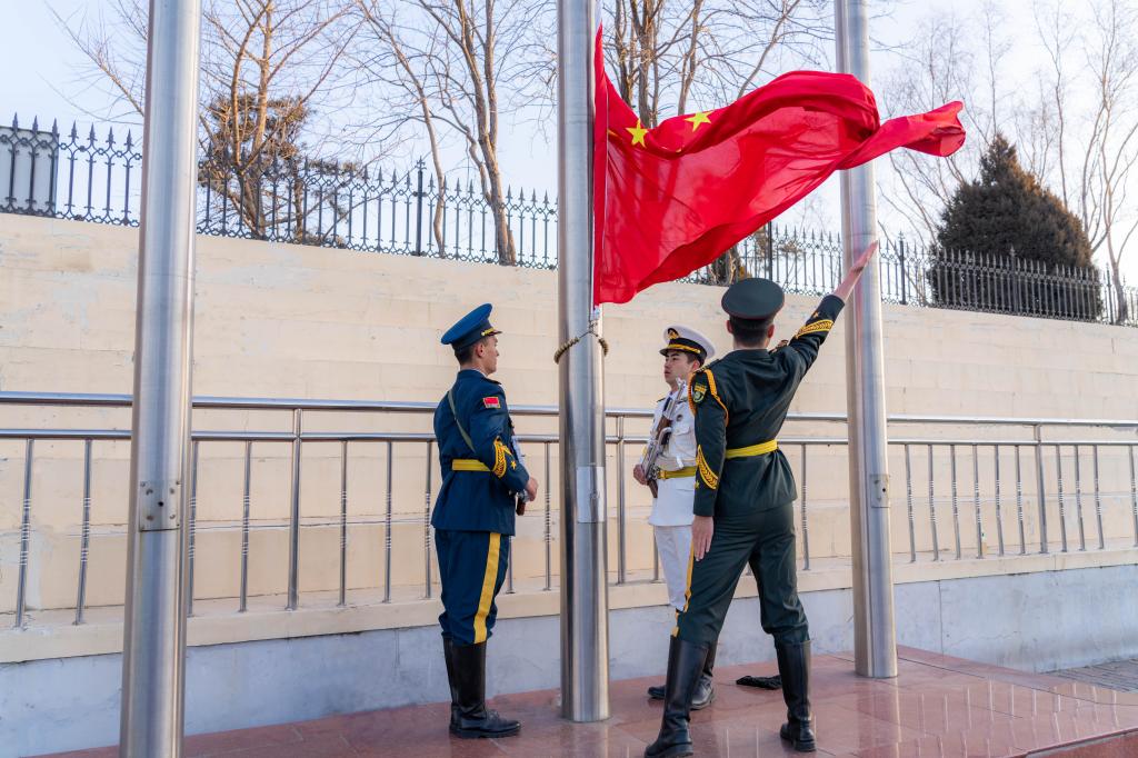 早上7时整,国旗护卫队雄姿英发、目光坚定,行进中步伐整齐划一,铿锵有力。伴随着校军乐队合奏的《义勇军进行曲》,鲜红的五星红旗冉冉升起,全体师生庄严肃立,高唱国歌行注目礼。