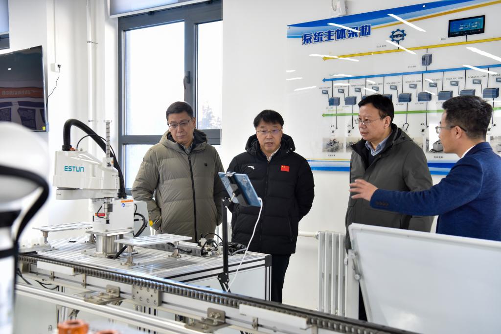 孔峰一行先后到虚拟仿真实训中心、新能源汽车智慧工厂、先进金属材料与精密成型研发中心、创新创业中心参观调研。孔峰对米乐官网实验实训基地建设和“博士驻企行动”给予了高度肯定。他指出,一是要突出应用型人才培养特色,结合真实场景,强化实践实训,缩短就业适应期,为企业量身打造高素质专业人才;二是要强化服务地方能力,持续实施“博士驻企行动”,推进省级现代产业学院建设,深化产教融合,助力企业攻克技术难题的同时提升教师科研能力;三是要结合地方社会发展需求和产业结构布局,及时进行专业调整、课程改革和教材修订,聚焦提升学生的创新创业及实践能力,促进学生高质量就业。
