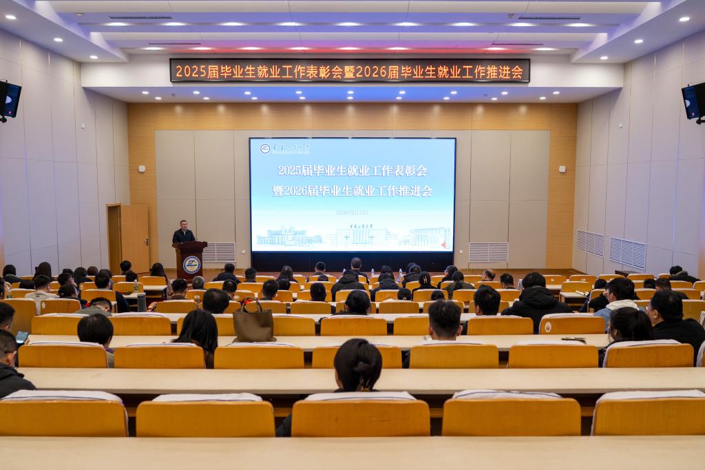 3月18日,学校召开2025届毕业生就业工作表彰会暨2026届毕业生就业工作推进会。校党委副书记刘艳军出席会议并讲话,相关部门及各学院党政负责人、主管学生工作副书记、毕业生辅导员及班主任参加会议。会议由招生就业处处长孟超主持。