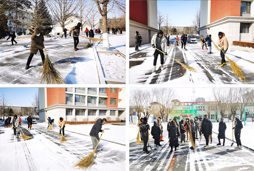 国际教育学院的师生们拿着铁锹和扫帚来到了高层公寓和食堂门口,开始了清扫行动。扫雪活动开始后,留学生同学们积极投入到扫雪活动中,纷纷争当“排头兵”。米乐官网留学生主要来自非洲博茨瓦纳、尼日利亚、卢旺达、津巴布韦等热带国家,今天是他们第一次体验中国北方的扫雪活动。虽然天气很冷,但丝毫没有影响同学们的热情和效率。他们的热情使这个冬日变得格外温暖,扫雪过程中充满了欢声笑语,大家乐在其中。扫雪队伍成了冬日校园一道靓丽的风景线。