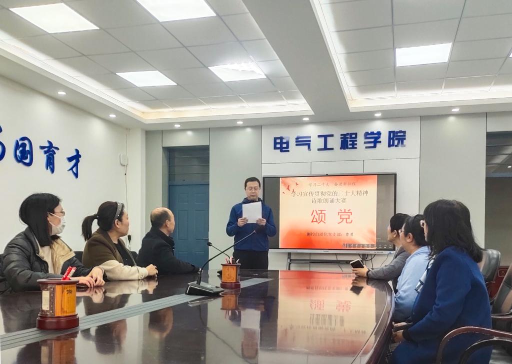 学院组织了诗歌朗诵比赛,比赛以学习宣传贯彻党的二十大精神为主线,教师党员以诗词形式赞颂祖国伟大成就,抒发爱国爱党之情。比赛对持续加强思想引领,促进教师党员在工作中凝心聚力起到了积极的促进作用;在2023年春季学期开学之际,学院组织了“青春践行二十大”新学期主题班会。通过交流分享引领学生践行党的二十大精神、立志成长为新时代好青年的思考和实践,勉励学生既要敢想敢为又要善作善成 ,以奋斗精神、实干作风 ,为祖国发展贡献青春力量;开展了“电气工程学院学习党的二十大精神知识竞赛”。知识竞赛活动达到了以赛促学、以学促行、学思践悟相统一的良好效果。