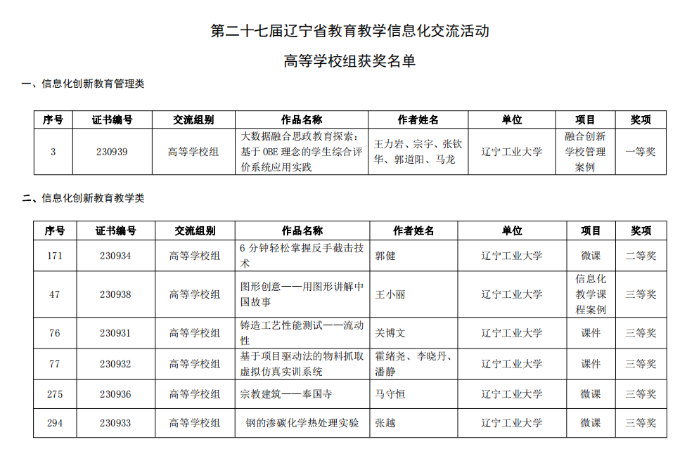 按照《辽宁省教育厅办公室关于开展第二十七届辽宁省教育教学信息化交流活动的通知》(辽教办〔2023〕125 号)要求,今年6月,经过教学单位推荐、学校评选,择优推送9件作品参赛,最终有7件作品获奖。此次成绩的取得,充分体现了米乐官网教师过硬的业务水平和良好的精神风貌,是米乐官网不断加强课程教学模式改革、鼓励教师充分运用信息化教学手段、更新教学内容、改革教学方法、全面应用教师数字化素养新标准,提升教师数字化素养的成果展示。