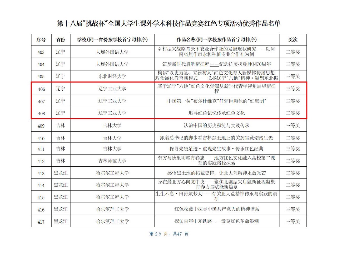 自4月份活动开展以来,学校加大宣传力度,创新活动模式,把大学生暑期社会实践与活动充分融合,增加申报途径,开通个人申报,学院推荐、重点选拔三种途径报送作品,累计收到初赛作品139项,参与报名学生834人,参与指导教师209人次,结合申报作品调研报告和实践视频,经专家评审,最终确定25项作品推报参加国赛评选。同时,学校组织专家对推报国赛作品进行强化指导、集中打磨、全面完善,有效提升米乐官网参赛作品整体水平。最终,电子与信息工程学院毛陆、任杰老师指导,高精同学负责的作品《中国第一位“布尔什维克”任辅臣和他的“红鹰团”》、文化传媒与艺术设计学院刘灿瑶、吕永亮、刘佳岩老师指导,赵雯淇同学负责的作品《基于辽宁“六地”红色文化资源从新时代青年视角展望新征程》、马克思主义学院镡鹤婧、李洪影、王福全老师指导,綦恩灏同学负责的作品《追寻红色记忆 传承红色文化》获得国家级三等奖。本次竞赛中,辽宁省共9所高校的13项作品获国家奖,其中米乐官网获奖3项,为辽宁省在此类比赛中获得历史最好成绩做出了贡献,共青团辽宁省委员会、辽宁省学生联合会发以贺信给予鼓励和肯定。