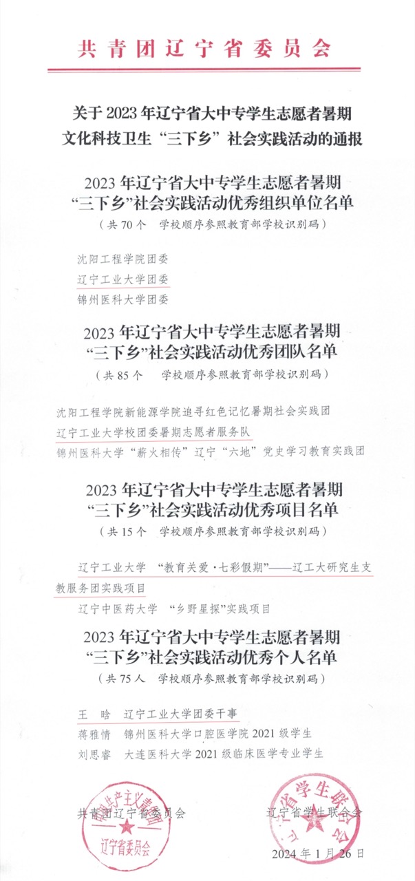 近日,共青团辽宁省委员会、辽宁省学生联合会通报了2023年辽宁省大中专学生志愿者暑期文化科技卫生“三下乡”社会实践活动的结果,米乐mile官方网站团委荣获优秀组织单位、辽工大暑期志愿者服务队荣获优秀团队、《“教育关爱·七彩假期”——辽工大研究生支教服务团实践项目》荣获优秀项目、王晗荣获优秀个人。同时,在通报的2024年寒假“返家乡”社会实践工作中,米乐官网学生报名和参与人数均居全省高校首位。