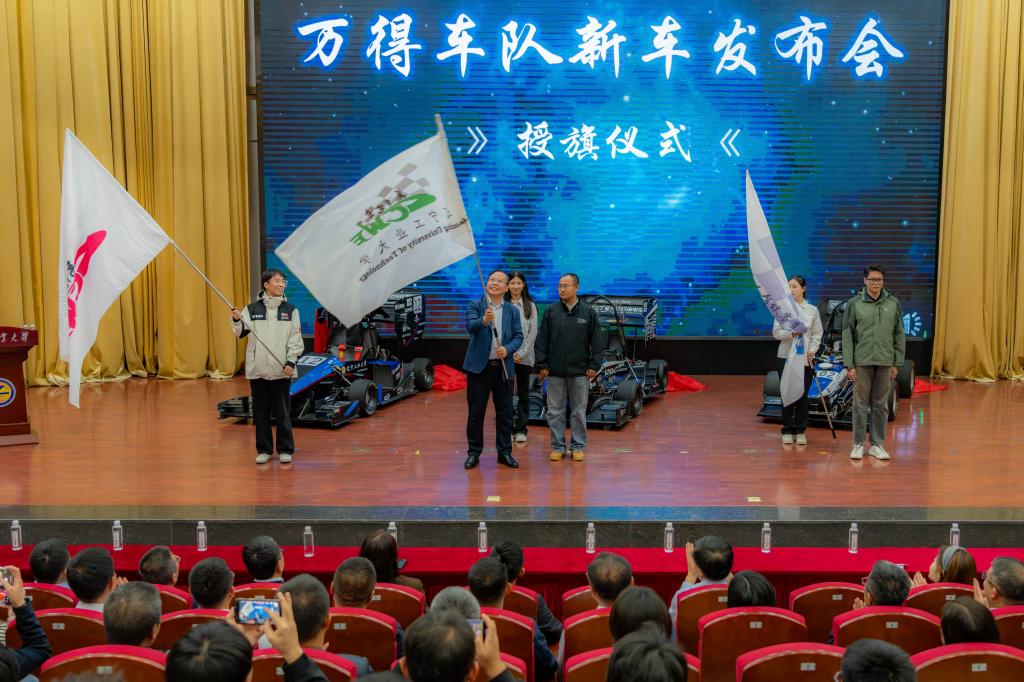 张启俭为三支车队授旗。赞助商代表和学校相关部门负责人为三辆新车揭幕。