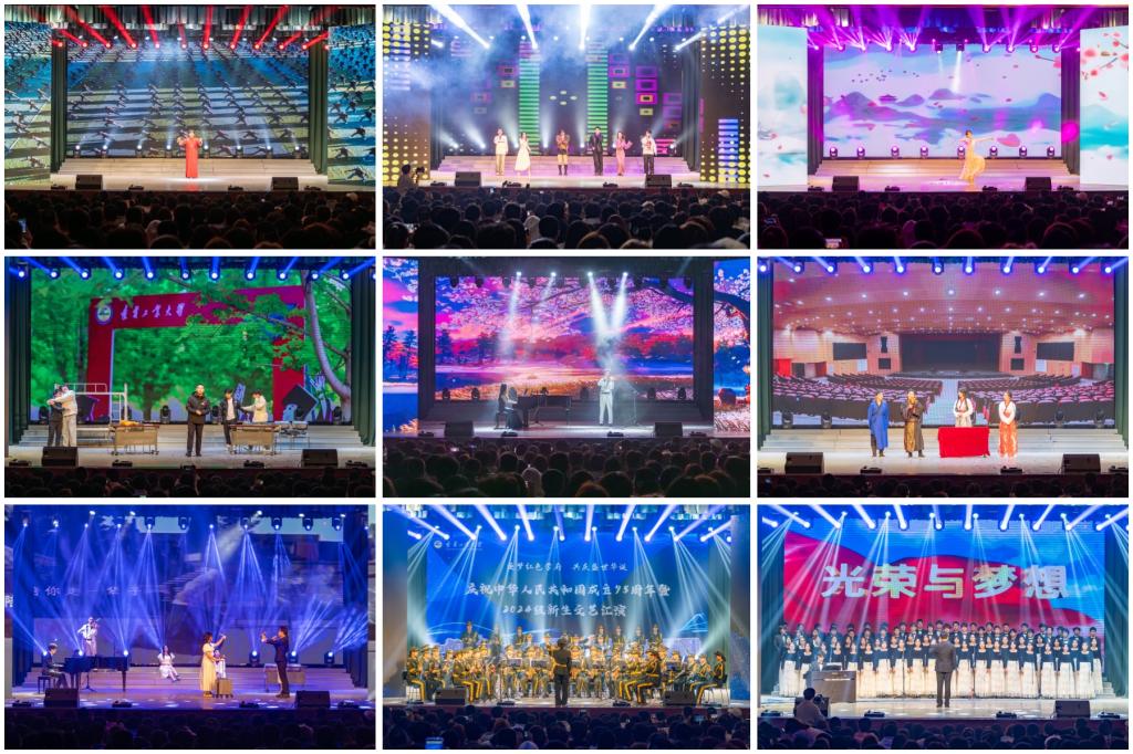 晚会以“逐梦红色学府 共庆盛世华诞”为主题,由红色学府、多彩青春、盛世华诞三个篇章组成,歌舞、语言、器乐、戏曲等各类型节目轮番上演,为师生带来一场精彩纷呈的视听体验。活动在舞蹈《We Rock》中拉开序幕,快板《我是辽工一个兵》、小品《同学你好》、歌曲串烧《违背的青春》《你要跳舞吗》、舞蹈《花神》、乐器合奏《花之舞》展现了2024级新同学从初入校园到悦享大学生活的美好场景,表达了同学们与辽工大这座红色学府的双向奔赴之情;歌曲《找自己》《萱草花》、小品《唐伯虎点秋香》、京剧《智取威虎山》、舞蹈《民族团结·礼赞祖国》、影子剧《光影青春》让同学们在青春的舞台上大放异彩,充分展现了青年学生积极向上、勤学进取的青春风貌;歌舞《我们都是追梦人》《藏男》、民乐合奏《双面燕洵》、诗朗诵《月光下的中国》、乐器合奏《云宫迅音》呈现了中华民族历经75载岁月更替,华章日新的伟大成就和辽工大青年以青春之姿、以奋斗之态,踔厉奋发、勇毅前行,为中国式现代化挺膺担当的青春本色。最后,演出在大学生合唱团《光荣与梦想》的歌声中圆满落下帷幕。