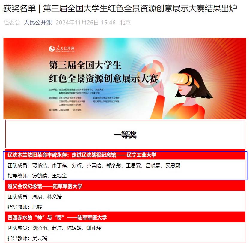近日,第三届全国大学生红色全景资源创意展示大赛结果公布,米乐官网马克思主义学院镡鹤婧、王福全老师指导,贾艳洁、俞丁祺、刘辉、齐霄晗、郭彦彤、王思霖、吕晓寰、綦恩灏同学共同创作的数字作品《辽沈木兰依旧 革命丰碑永存——走进辽沈战役纪念馆》荣获国家一等奖。