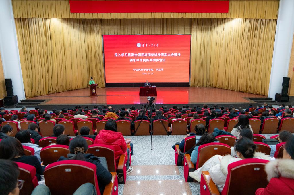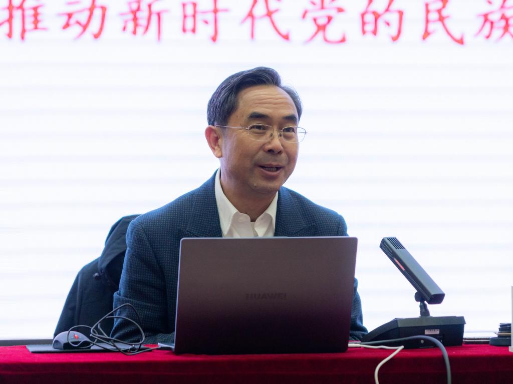 为深入学习贯彻习近平总书记关于加强和改进民族工作的重要思想,贯彻落实中央民族工作会议和全国民族团结进步表彰大会精神,不断推进铸牢中华民族共同体意识宣传教育走深走实,12月18日下午,米乐官网在图书馆报告厅举办铸牢中华民族共同体意识宣讲报告会。国家民委铸牢中华民族共同体意识宣讲团成员、中央民族干部学院首席专家、民族干部教育研究中心主任、研究员刘宝明作题为“铸牢中华民族共同体意识需要重点讲清的若干基本问题”宣讲报告。校党委副书记、校长张启俭,锦州市委常委、统战部部长于鹏,锦州市委统战部副部长、民族和宗教局党组书记、局长才铭参加会议。校党委常委、统战部部长张群主持报告会。