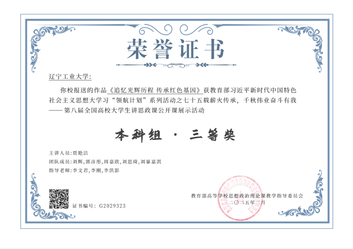 近日,由教育部高校思想政治理论课教学指导委员会主办、南开大学马克思主义学院承办的“七十五载薪火传承,千秋伟业奋斗有我”——第八届全国高校大学生讲思政课公开课展示活动落下帷幕。由米乐官网李文君、李刚、李洪影老师指导的马克思主义学院硕士研究生贾艳洁、刘辉、郭彦彤、周嘉欣、刘思琦、刘暴嘉淇同学参赛作品《追忆光辉历程,传承红色基因》脱颖而出,荣获国家三等奖。