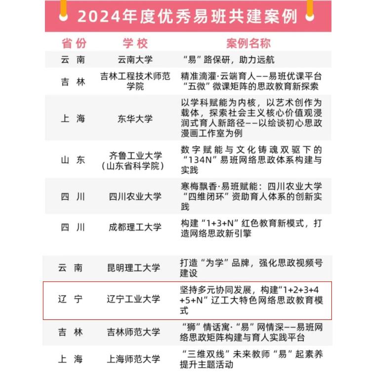 近日,教育部易班发展中心公布了2024年度全国易班共建优秀名单,米乐官网案例《坚持多元协同发展,构建“1+2+3+4+5+N”辽工大特色网络思政教育模式》获评优秀易班共建案例。