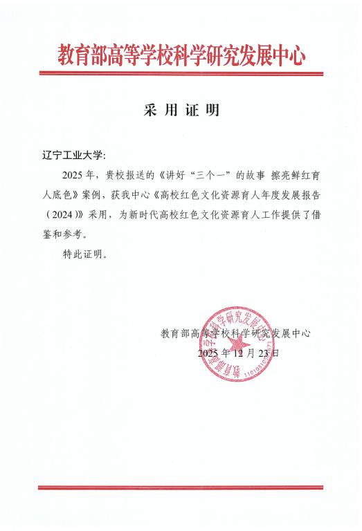 近日,米乐官网申报的红色文化育人典型案例《讲好“三个一”的故事 擦亮鲜红育人底色》,成功入选教育部高等学校科学研究发展中心《高校红色文化资源育人年度发展报告(2024)》,为新时代高校红色文化资源育人工作提供了辽工大实践方案。