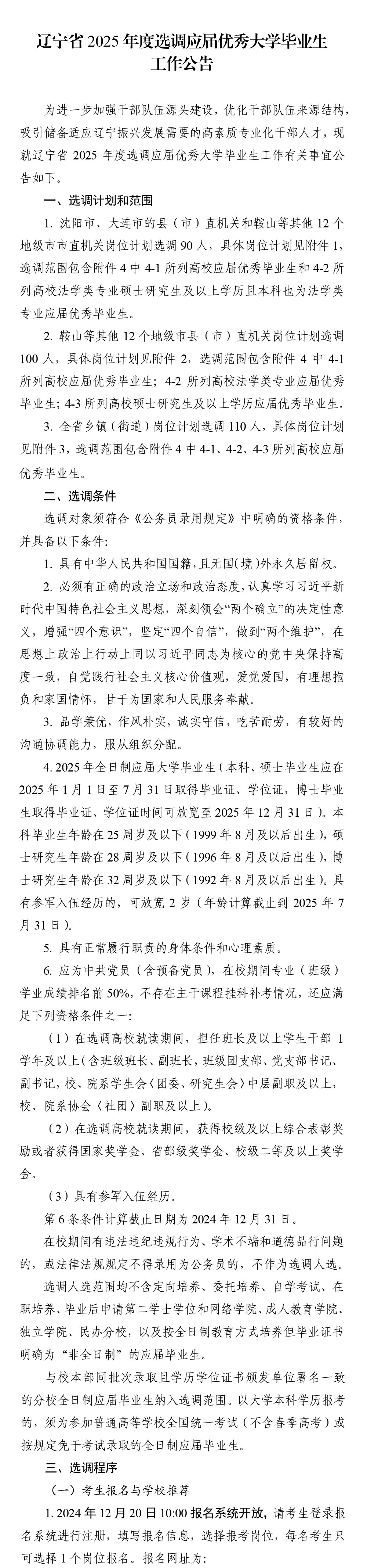 辽宁省2025年度选调应届优秀大学毕业生工作公告