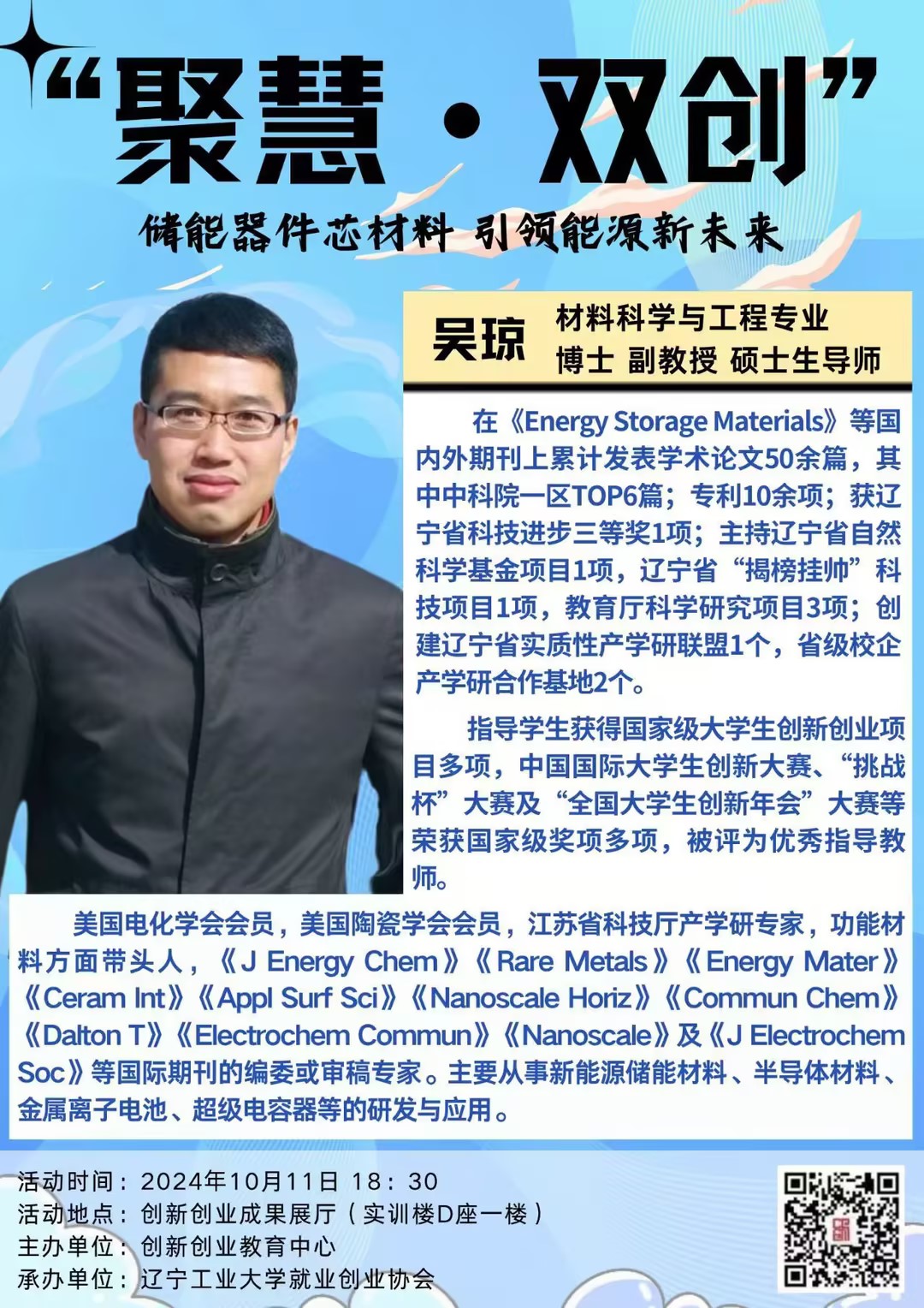 在《Energy Storage Materials》等国内外期刊上累计发表学术论文50余篇,其中中国科学院一区TOP6篇;专利10余项;获辽宁省科技进步三等奖1项;主持辽宁省自然科学基金项目1项,辽宁省“揭榜挂帅”科技项目1项,教育厅科学研究项目3项;创建辽宁省实质性产学研联盟1个,省级校企产学研合作基地2个。指导学生获得国家级大学生创新创业项目多项,中国国际大学生创新大赛、“挑战杯”大赛及“全国大学生创新年会”大赛等荣获国家级奖项多项,被评为优秀指导教师。